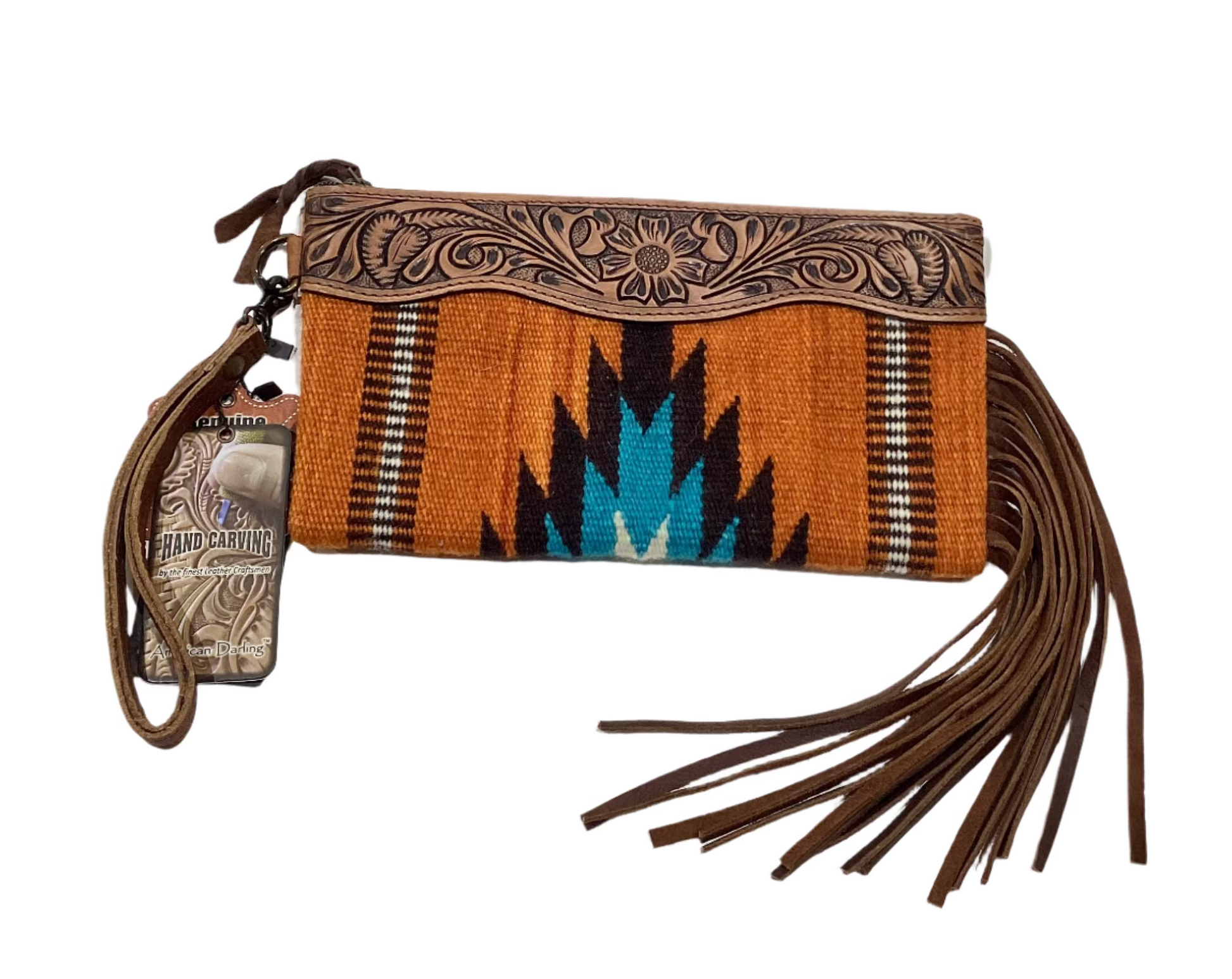 AMERICAN DARLING AZTEC & TOOLED LEATHER CLUTCH WITH FRINGE - GOLD