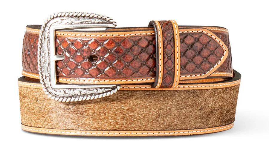 This Ariat men’s belt is genuine leather. It features a tan calf hair inlay with diamond embossed billets. The antique silver finish buckle has a scrolling design, with a rope edge.