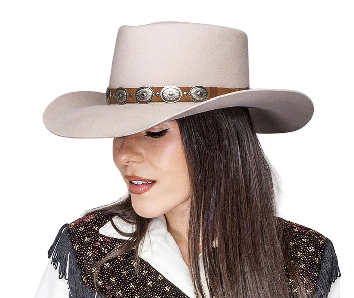 The Ellsworth is a teardrop crown, with a classic shaped 3 1/2" brim. In black it comes with a black and silver concho band, and in mist it comes with a brown genuine leather and silver concho band, giving it an Old West feel.
