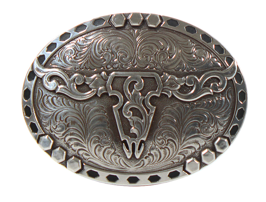 This oval Nocona men's western buckle is definitely a head turner. Engraved floral background and a floral designed bull skull. The outer edges are smooth with hexagon studs to accent.