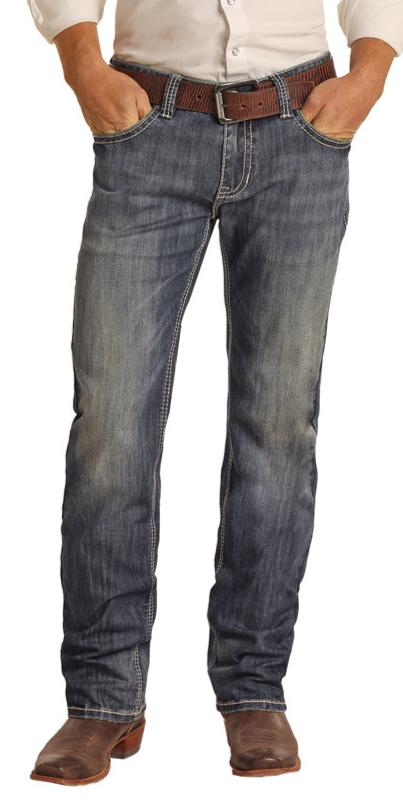 A great new men's relaxed fit jean from Rock & Roll Cowboy! It is a medium vintage wash that features a back pocket detail with a triple " V" stitch. Classic 5 pocket design with ivory topstitching throughout.