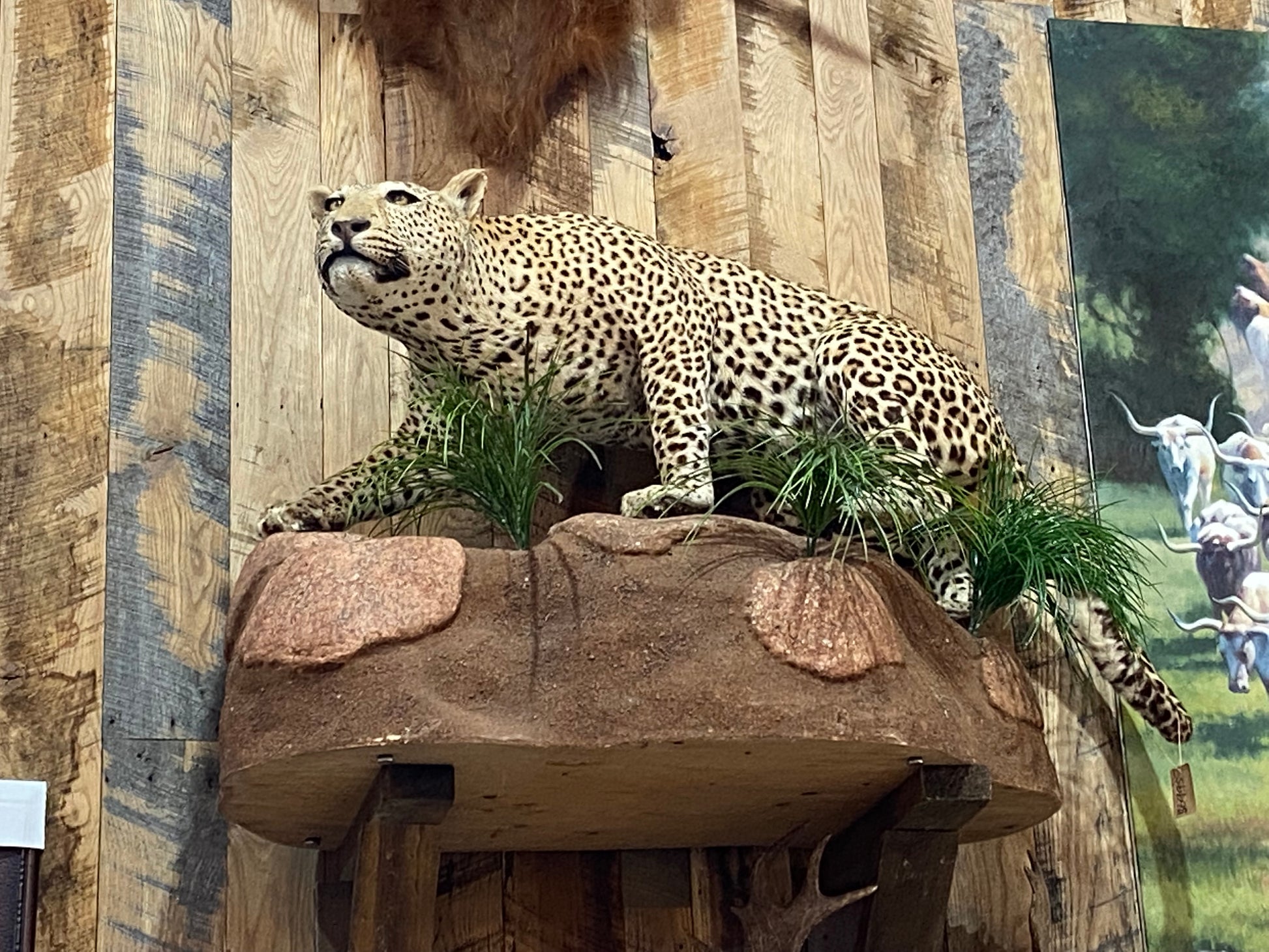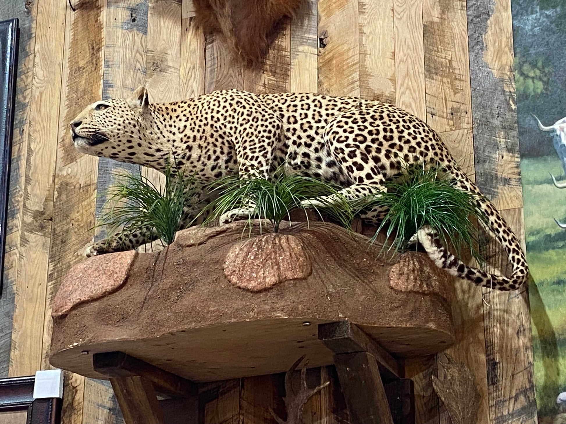 This full body leopard mount is truly a unique piece. From Zimbabwe harvested in 2004. Sits gently in the rock base so it is able to be changed if need be. Originally sat on the floor but a built shelf can display it nicely on any wall of your choosing. About 5 feet in length total.