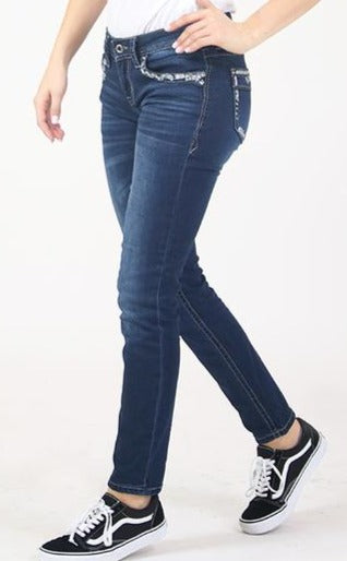The Grace in LA women’s skinny jean sits right at the waist to create a hip hugger feel on the hips and thighs. This jean is detailed with a dark wash and embellished and faux zipper design on the back pockets, natural hand-sanding, and whiskering. The denim fabric has the perfect amount of stretch and great holding power.