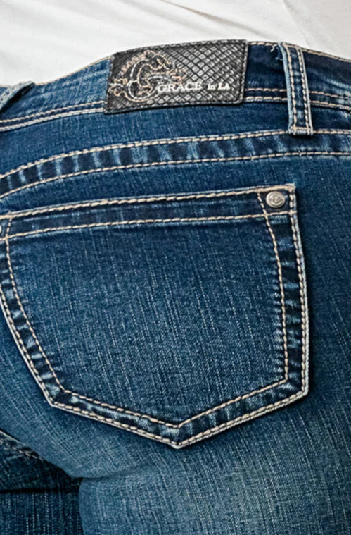 The Grace in LA women's basic bootcut jean in Easy Fit shows off your best shape. The mid-rise medium wash creates a form-flattering fit for every curve. The denim fabric has the perfect amount of stretch and great holding power.