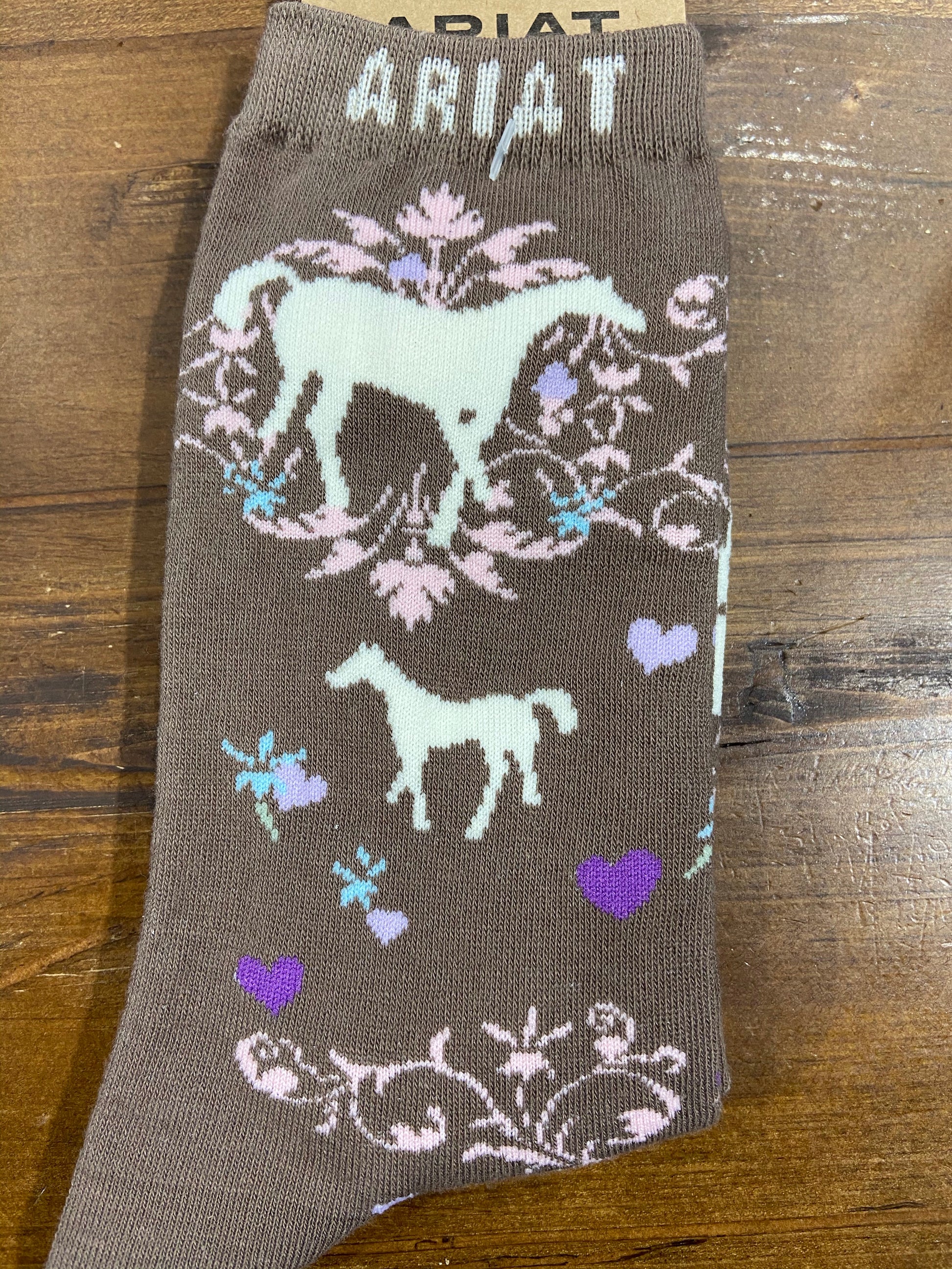 This Ariat crew sock features the “horse love”. Having horses along with hearts on it. Fits shoe size 4-10