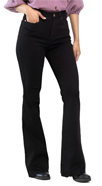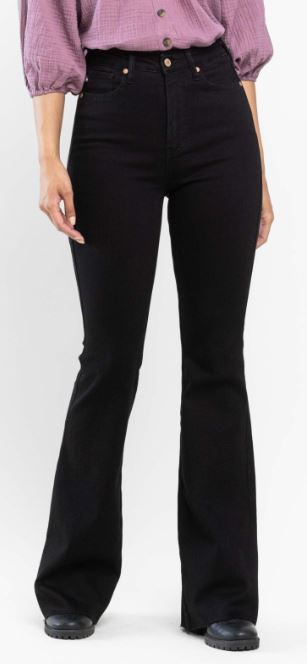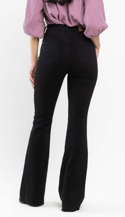 Meet the Judy Blue High Rise Tummy Control Flare Jeans in black denim. These jeans are crafted to provide a flattering fit with their high-rise design and tummy control feature.