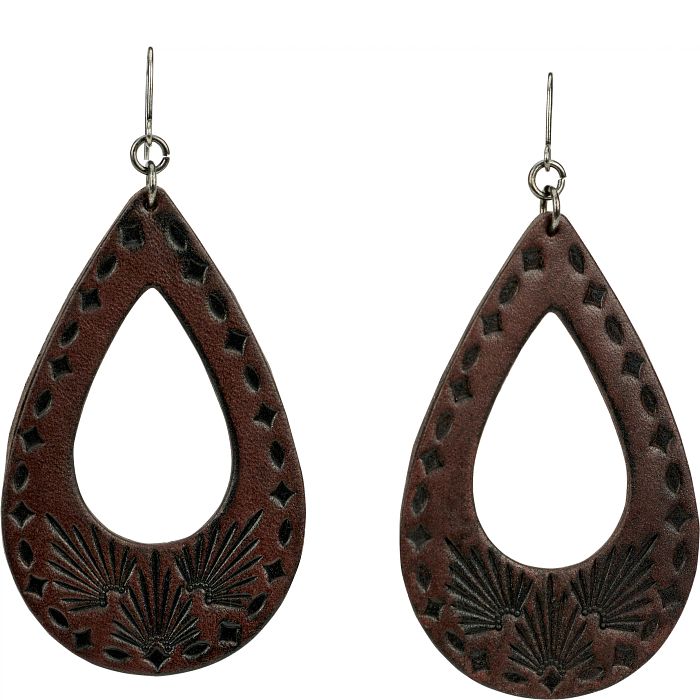 JUSTIN EARRINGS, EAR WIRE ATTACHMENT, GENUINE LEATHER W/TOOLED PATTERN, EAR WIRE IS PLATED COPPER, OTHER METAL IS ZINC ALLOY