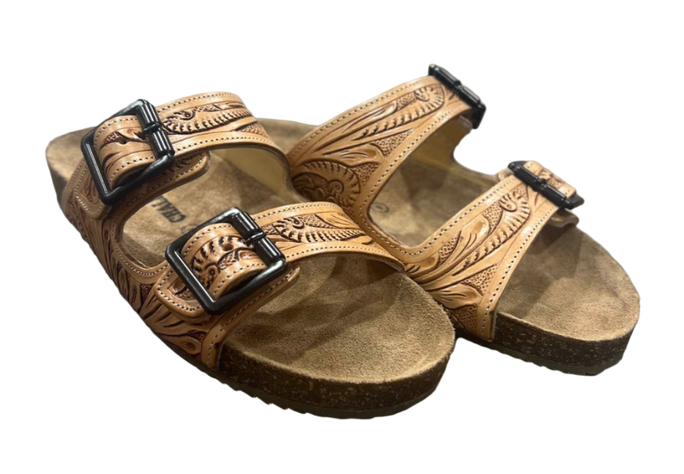 Step into boho-Western elegance with these hand-tooled leather sandals Featuring delicate floral accents and antique buckle details on a cork footbed, these adjustable slides merge free-spirited style with everyday comfort. Perfect for the modern wanderer.