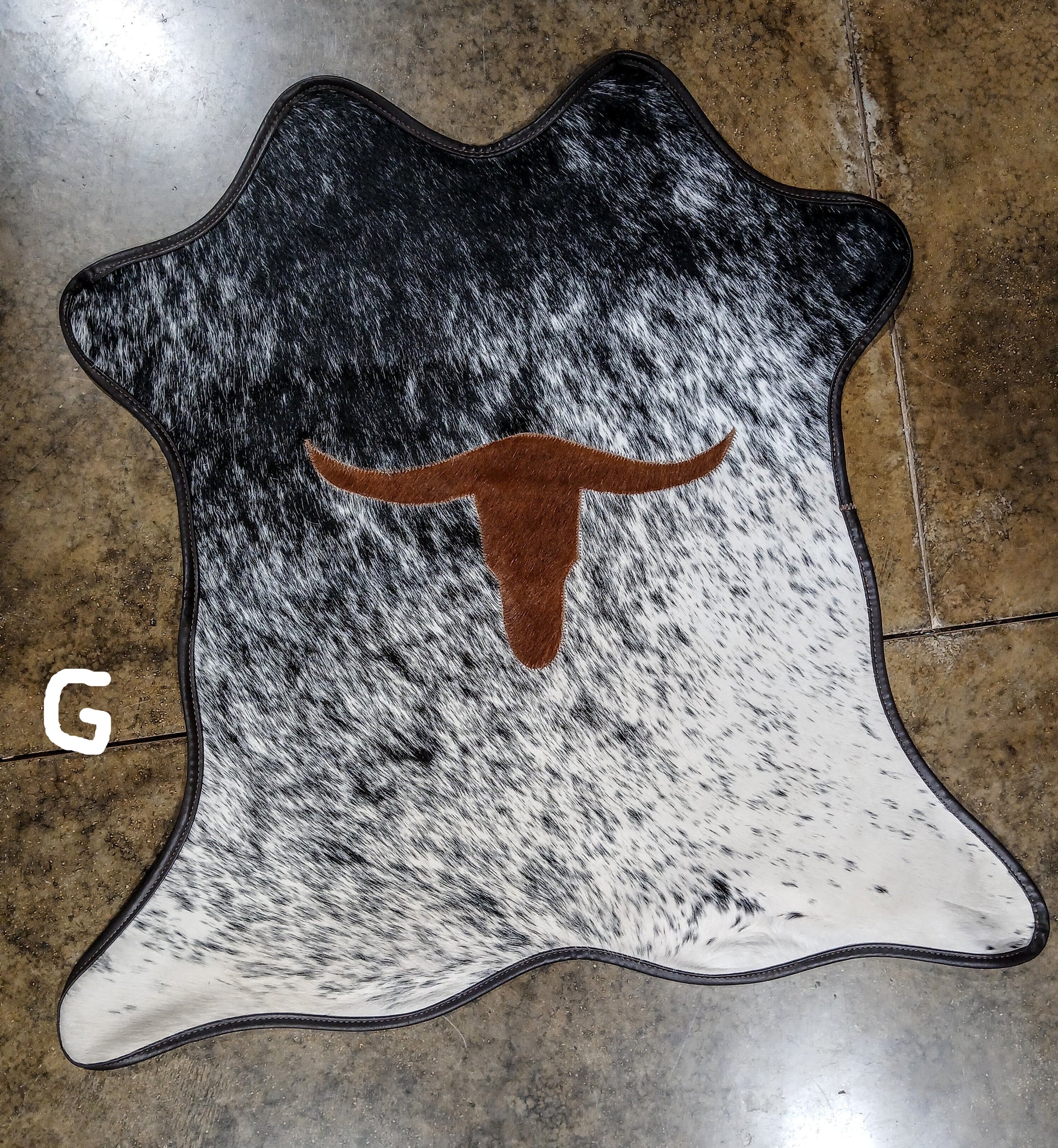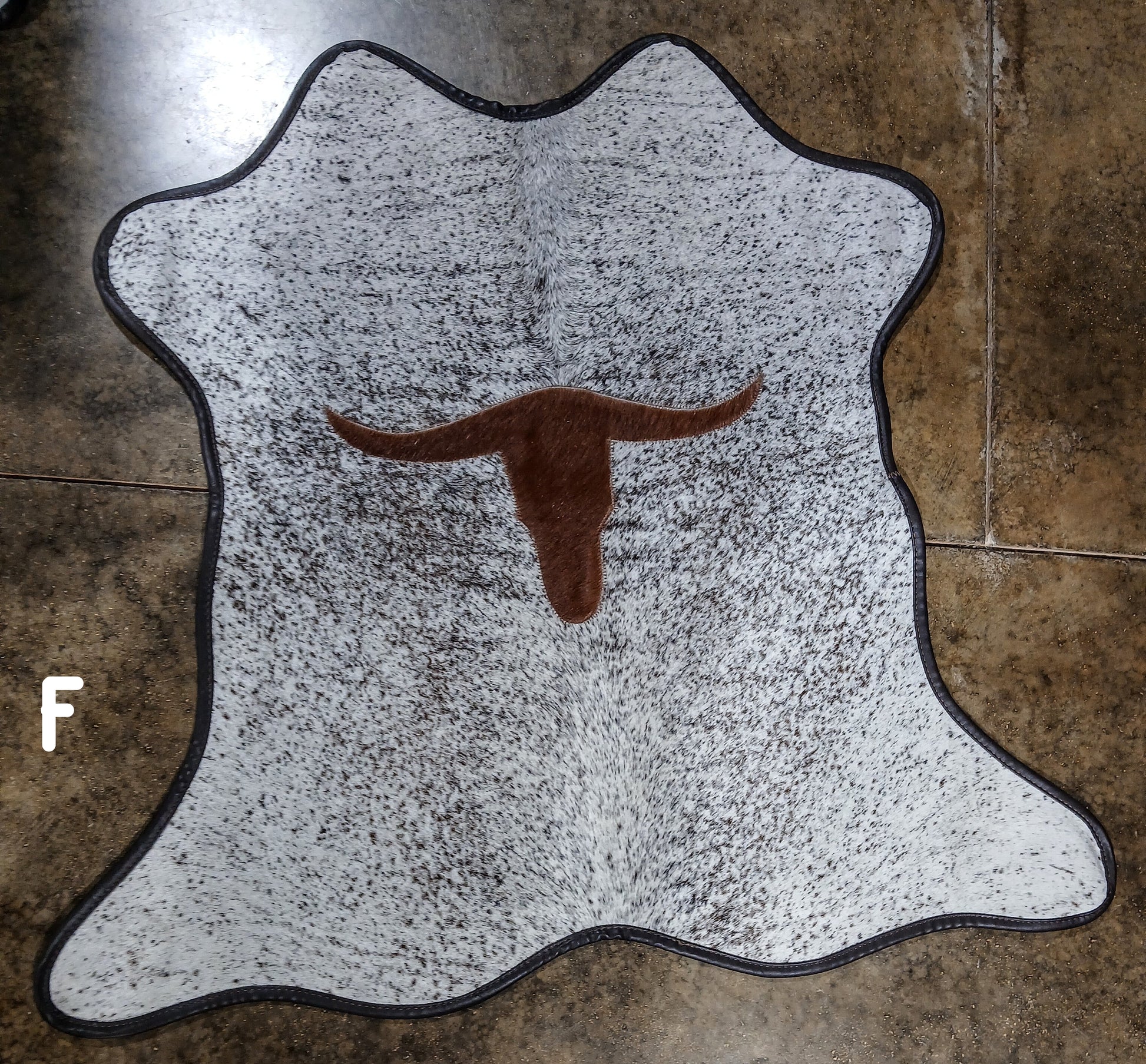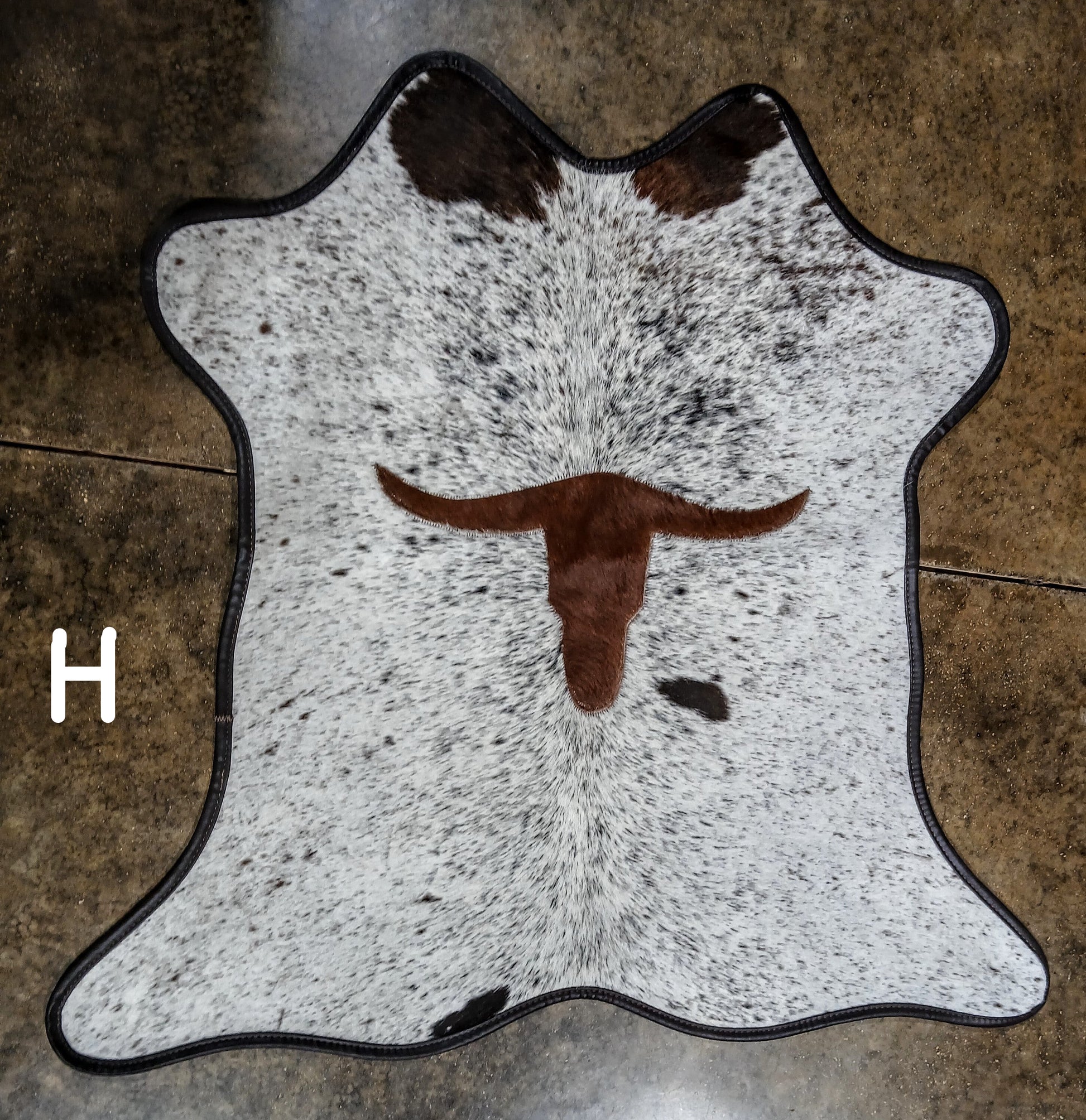 These fun leather trimmed rugs feature natural calf hide and a brown hide inlayed Longhorn. Available in 3 hide color/patterns.