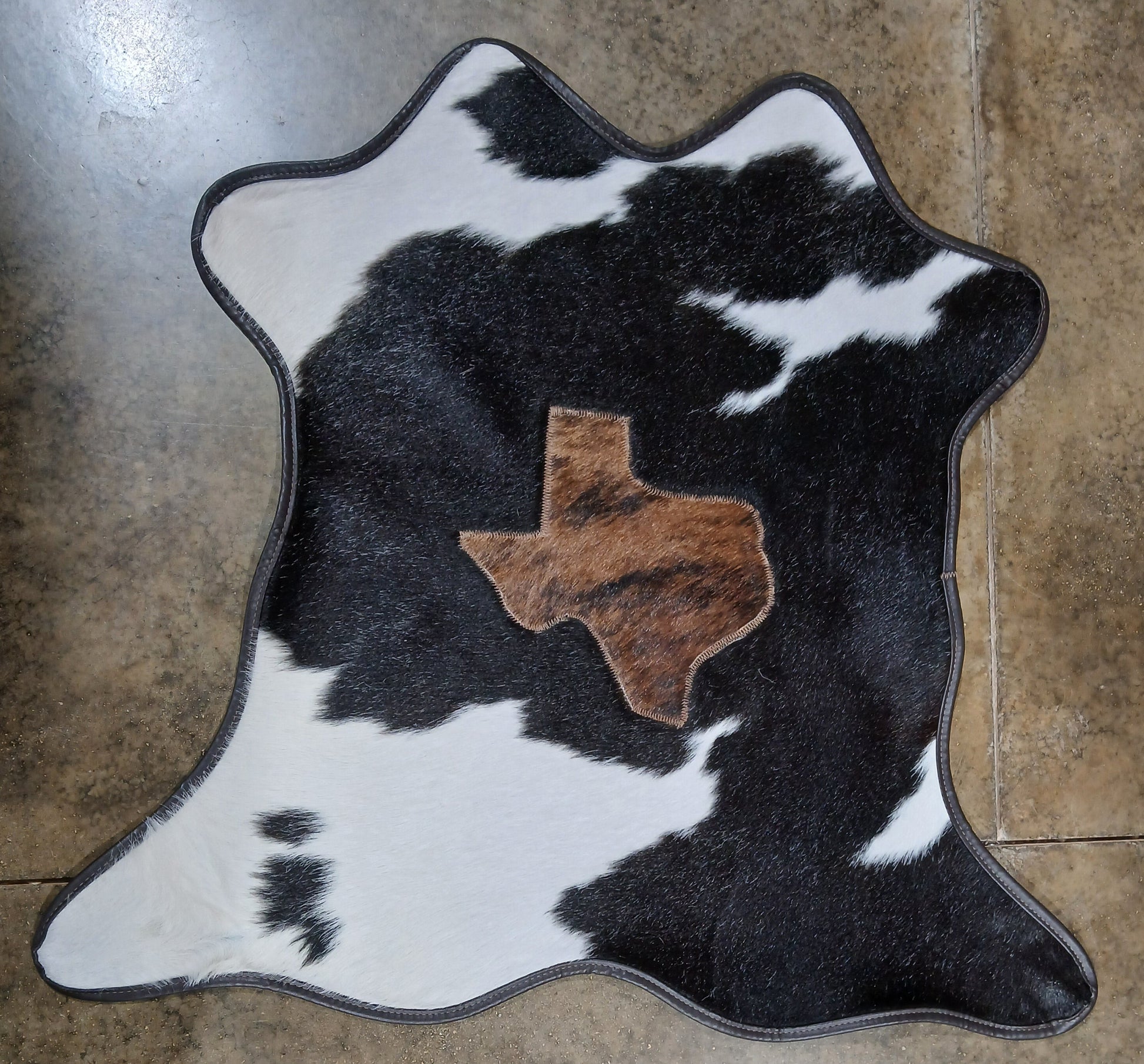 These fun leather trimmed rugs feature natural calf hide and a brown hide inlayed State of Texas.