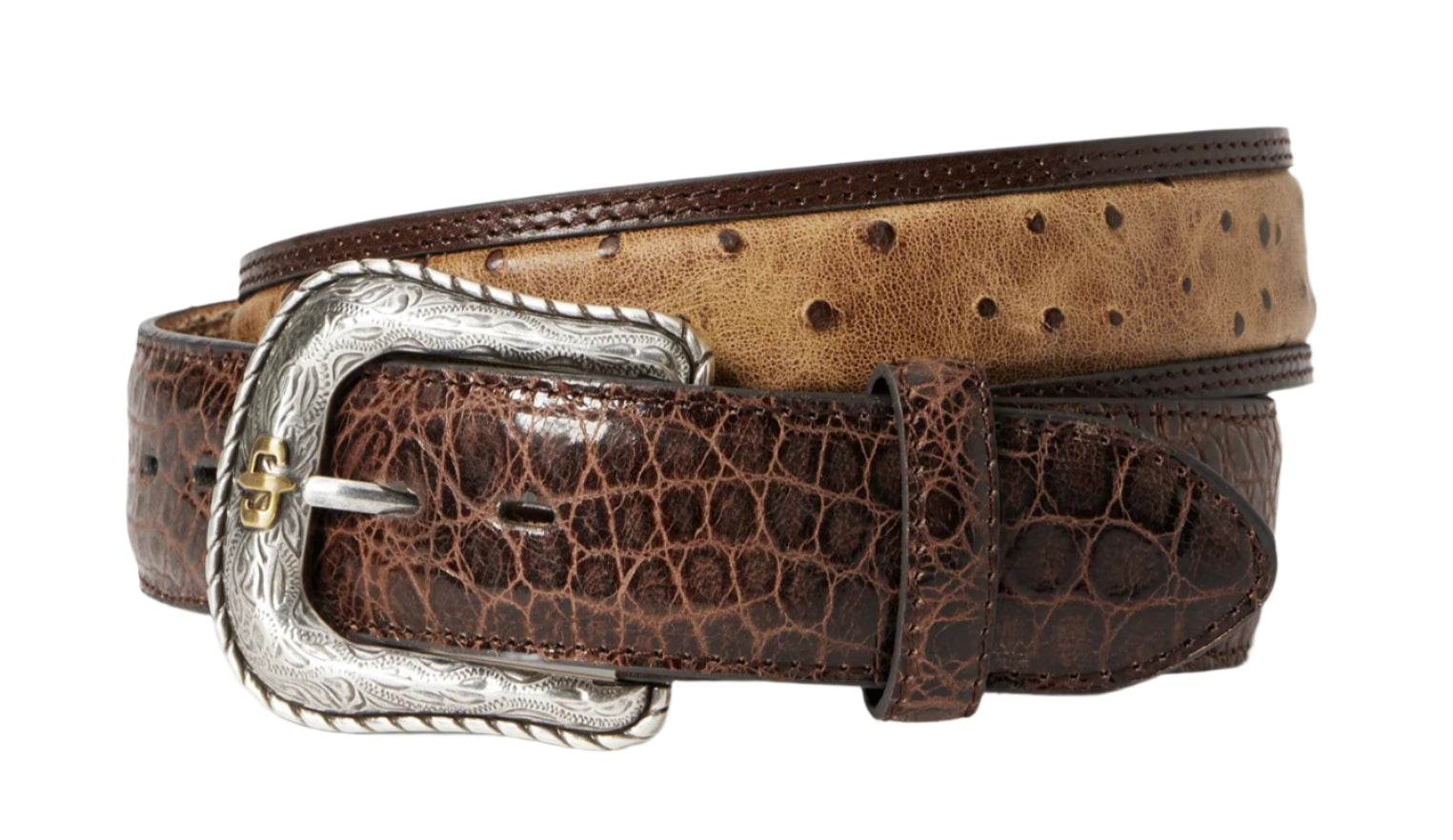 Made from top grain Italian leather, this belt has a 1 ½” wide California nut ostrich print strap and cognac croc embossed western tabs. It features seven holes on the point end to ensure a proper fit for all body types and is finished with a two-tone Stetson buckle. At once rugged and refined, each of our belts embodies our legendary commitment to quality and attention to detail.