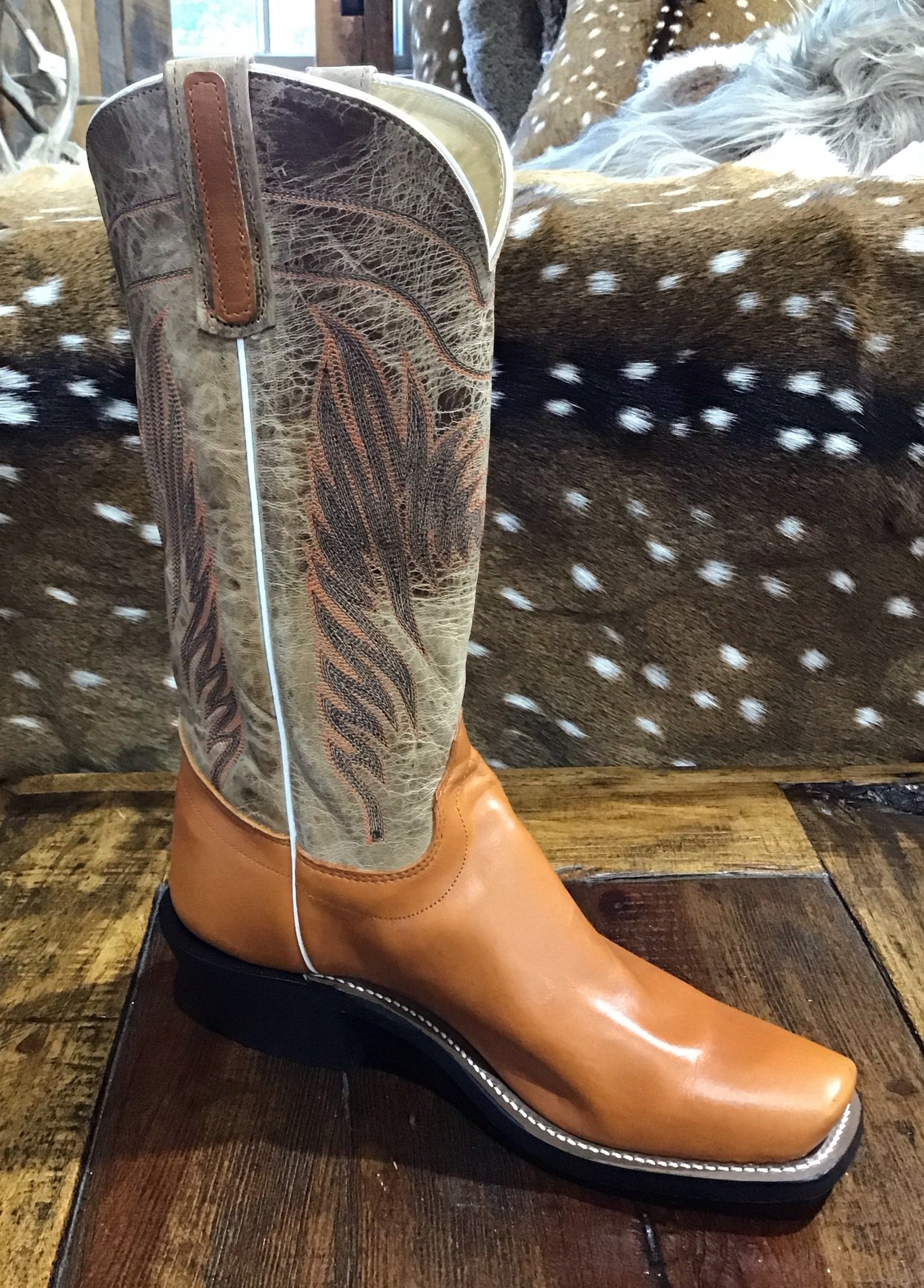 These Olathe Men’s boots are the embodiment of old cowboy boots. with the cutter toe and with a rider heel, tops off nicely with a classic leather sole. The soft light orange vamp with the tan top with orange and brown stitching.