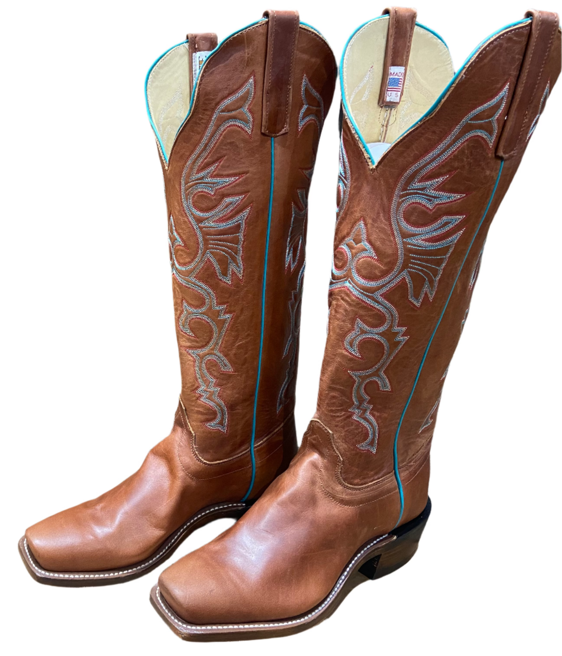 This custom boot from Olathe mixes dress and casual together in the greatest way possible. Being a light reddish tan fused with teal stitching and piping helps create a feel for work and luxury for both men and women. All leather sole, cutter toe (O toe) and riding heel with spur rest and a 16" top creates a great boot for all to enjoy.
