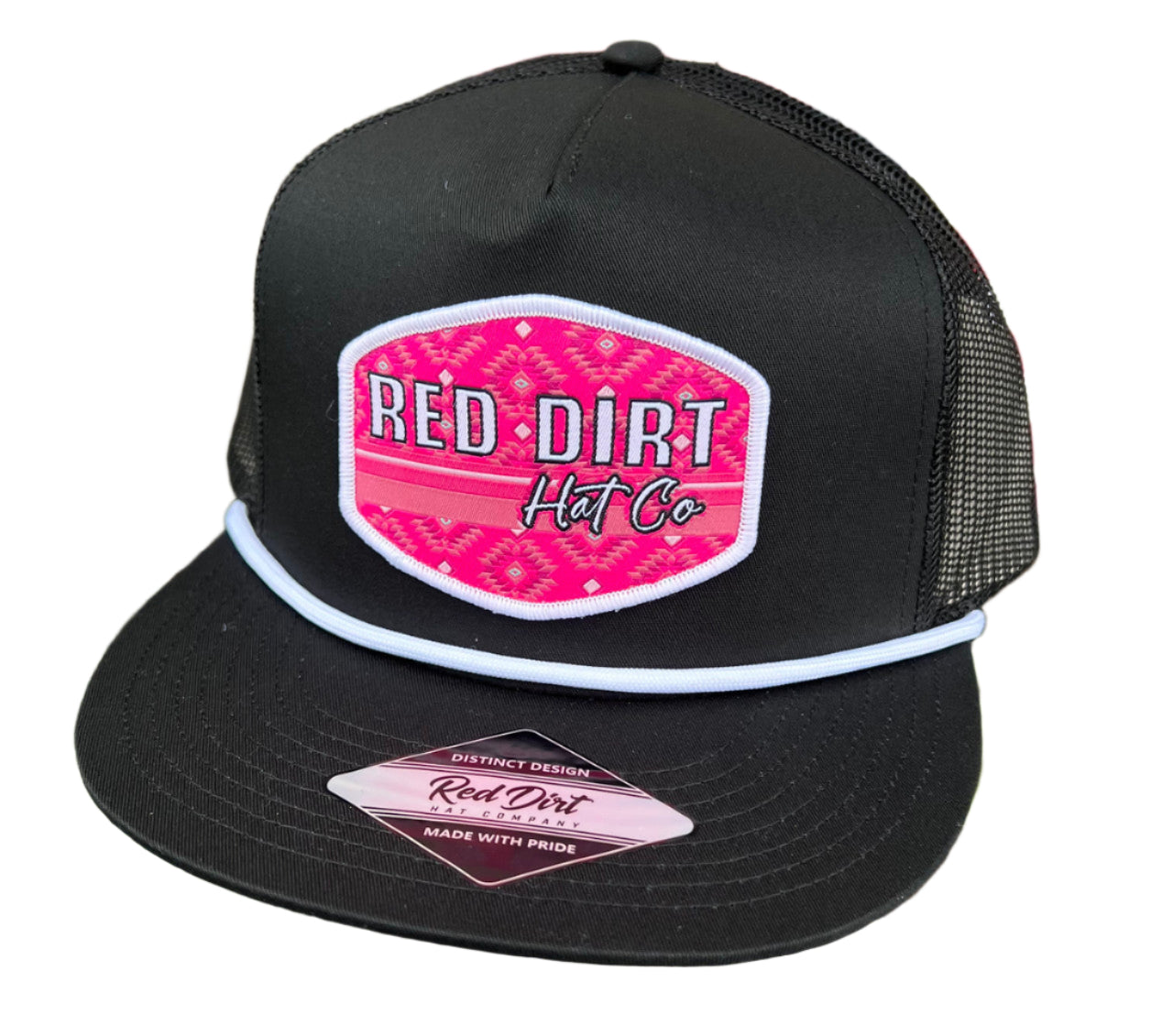 Turn heads and show your bold side with this Pink aztec patched hat from Red Dirt Hat Company. This eye-catching cap features a vibrant pink aztec patch framed in a white embroidery. This is a perfect contrast against the all black cap. A white rope detail across the bill adds a clean, classic finish. Whether you're on the ranch or downtown, this hat delivers fearless western style with a modern twist.