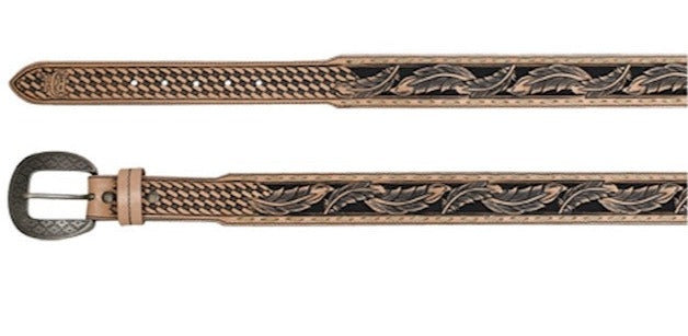 RED DIRT HAT COMPANY MENS BELT VACHETTA LEATHER W/BASKETWEAVE AND FEATHER TOOLING