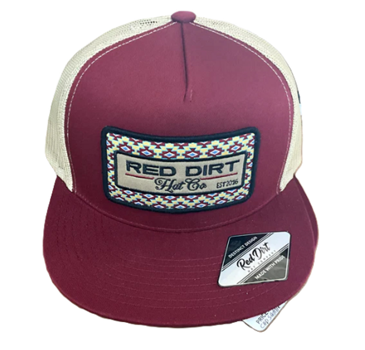 Red Dirt Hat Co adult hat in Burgundy/Khaki with a 5-panel snapback featuring the exclusive “Saddle Up Aztec” patch.