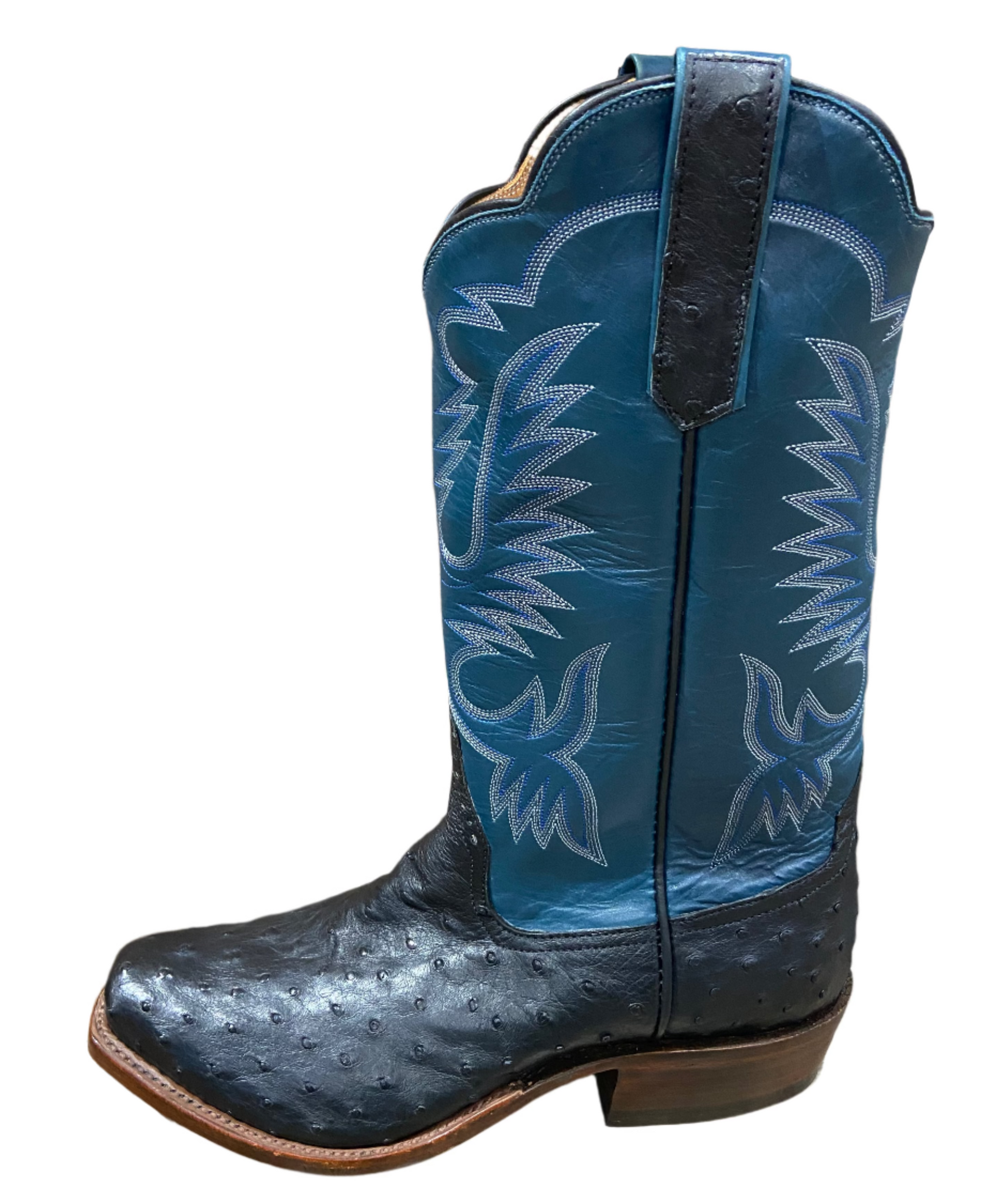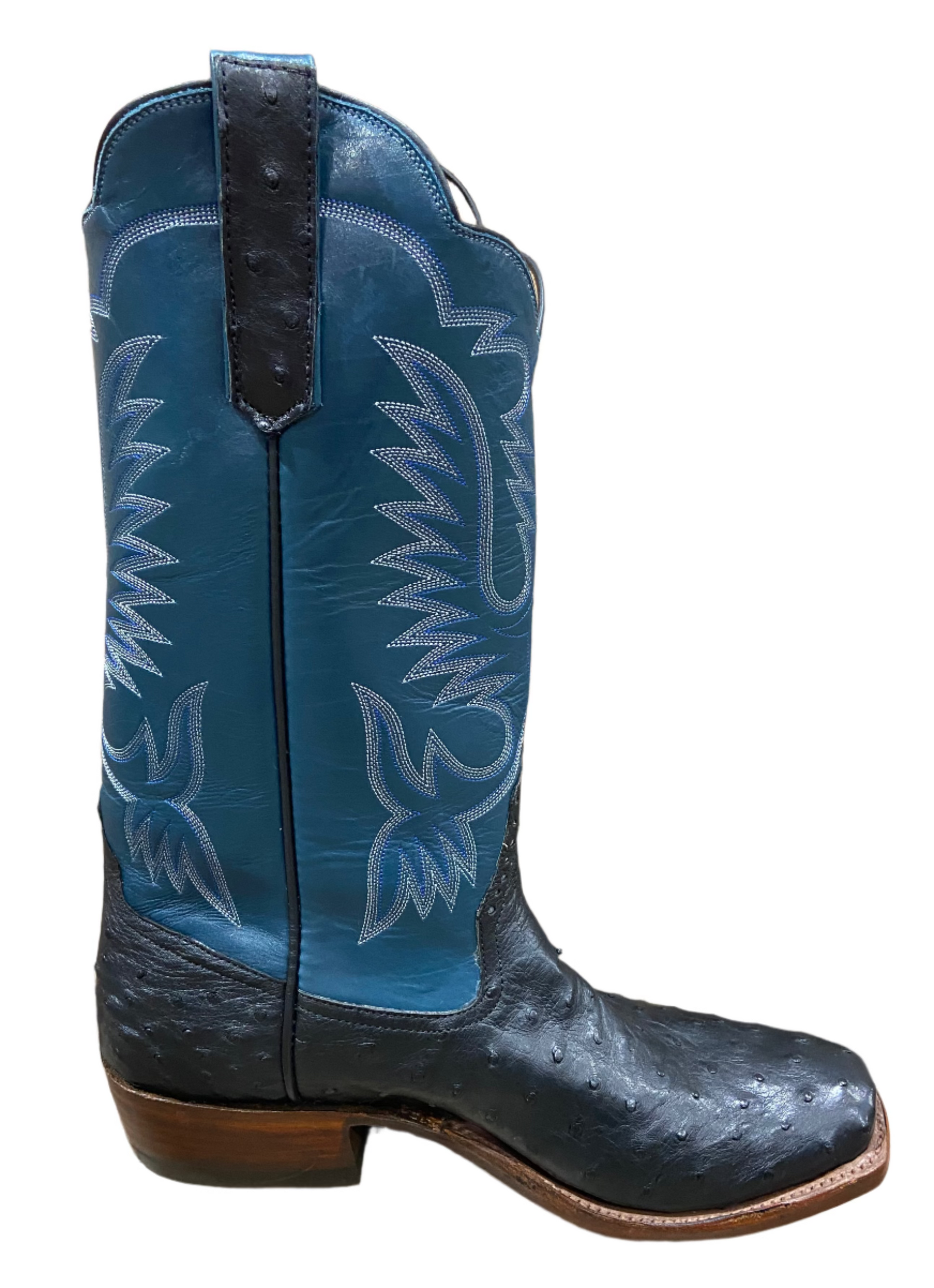 This Rios ostrich boot is what it means to mix fancy with a great handcrafted boot. Being an all black full quill ostrich put with a navy blue top makes for a fantastic match for a boot. Topped with a leather sole, cutter toe (O toe) and a riding heel and a 13" makes this a must have.