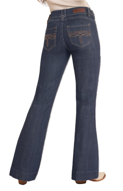 ROCK AND ROLL DENIM LADIES DIAMOND BELT LOOP BOOT STITCH MR TROUSER / DARK WASH