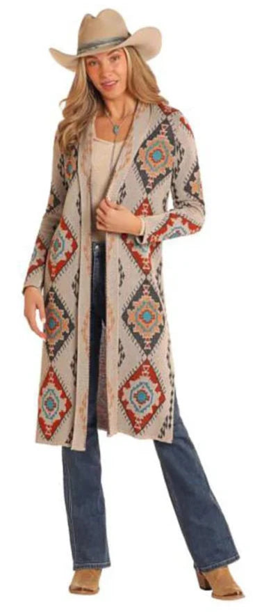 ROCK AND ROLL LADIES AZTEC KNIT DUSTER in EGGSHELL
