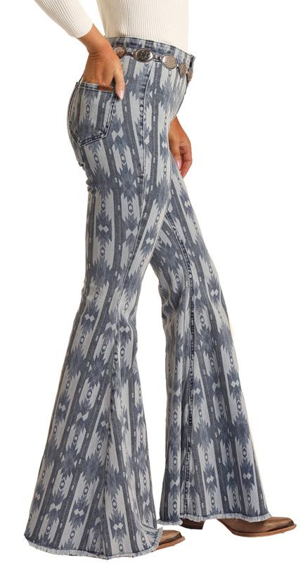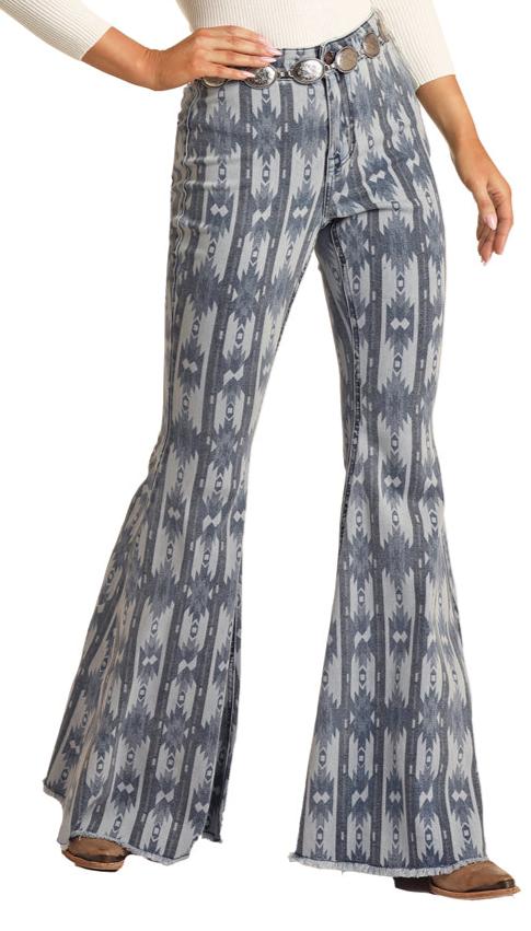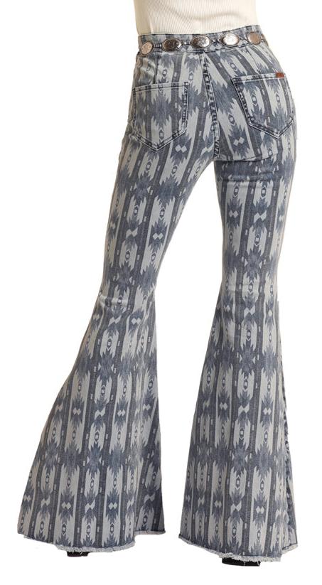 ROCK & ROLL COWGIRL LADIES HIGH RISE EXTRA STRETCH AZTEC PRINT BELL BOTTOM JEANS