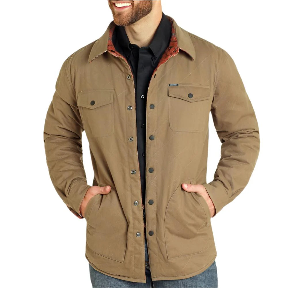 The Rock & Roll Denim Men's Reversible Herringbone Jacket is a versatile and stylish addition to any wardrobe. This khaki jacket is reversible, allowing you to switch up your look with ease. The aztec print on one side adds a unique touch, while the solid khaki on the other side provides a more classic and understated option. With a full snap closure, double chest pockets, and double hand pockets, this jacket offers both functionality and fashion. The adjustable cuffs ensure a perfect fit every time.