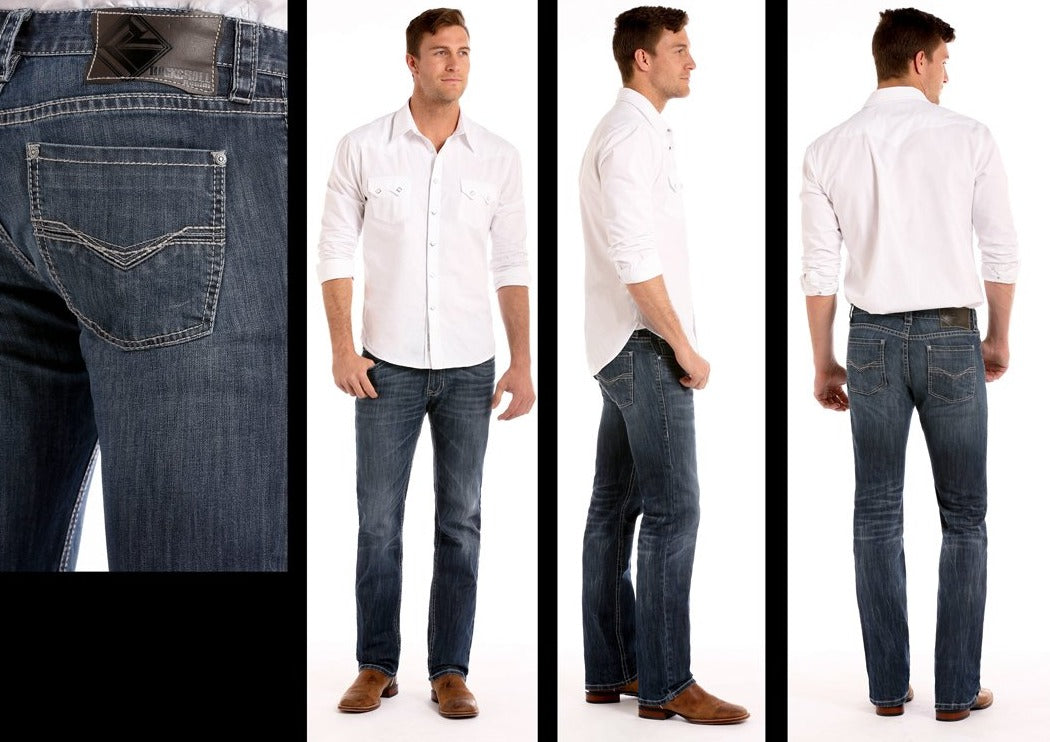 Men's ReFlex, Revolver straight leg jeans in a dark vintage wash with small "V" embroidery and denim applique details on the back pockets. Light grey top-stitching and brushed silver trims.