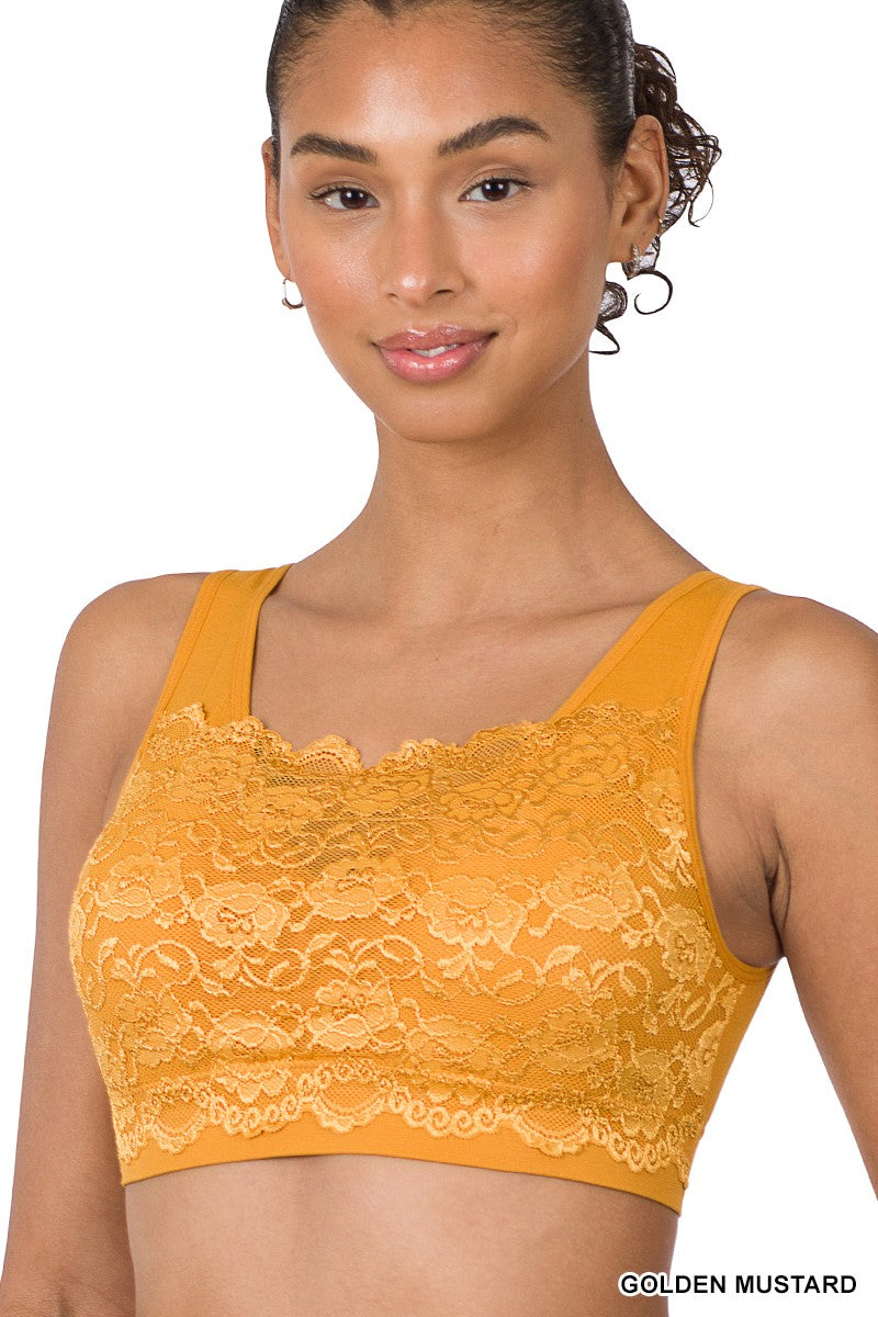 SEAMLESS BRA TOP WITH FRONT LACE COVER in GOLDEN MUSTARD