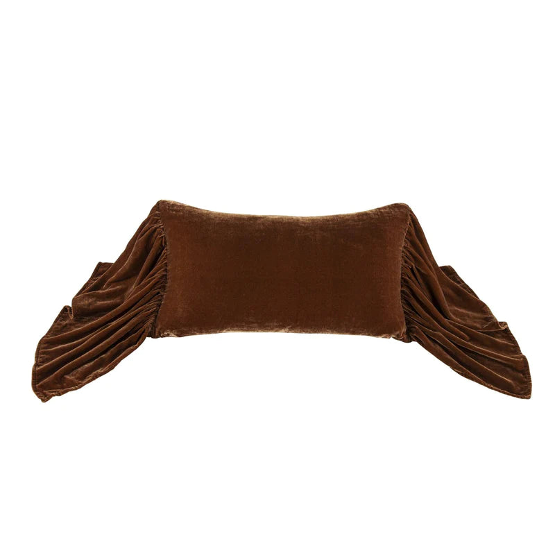 STELLA FAUX SILK VELVET LONG RUFFLED PILLOW in COPPER BROWN