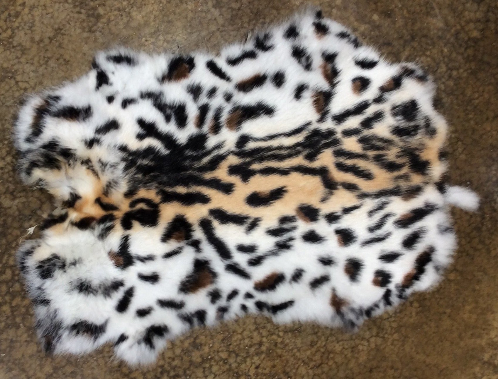 This cute, stenciled Rabbit hide in a leopard pattern. They are great to set on an end table or any other decor area. Most of these hides are 1 1/2' by 1'. H-RABBIT-P #9