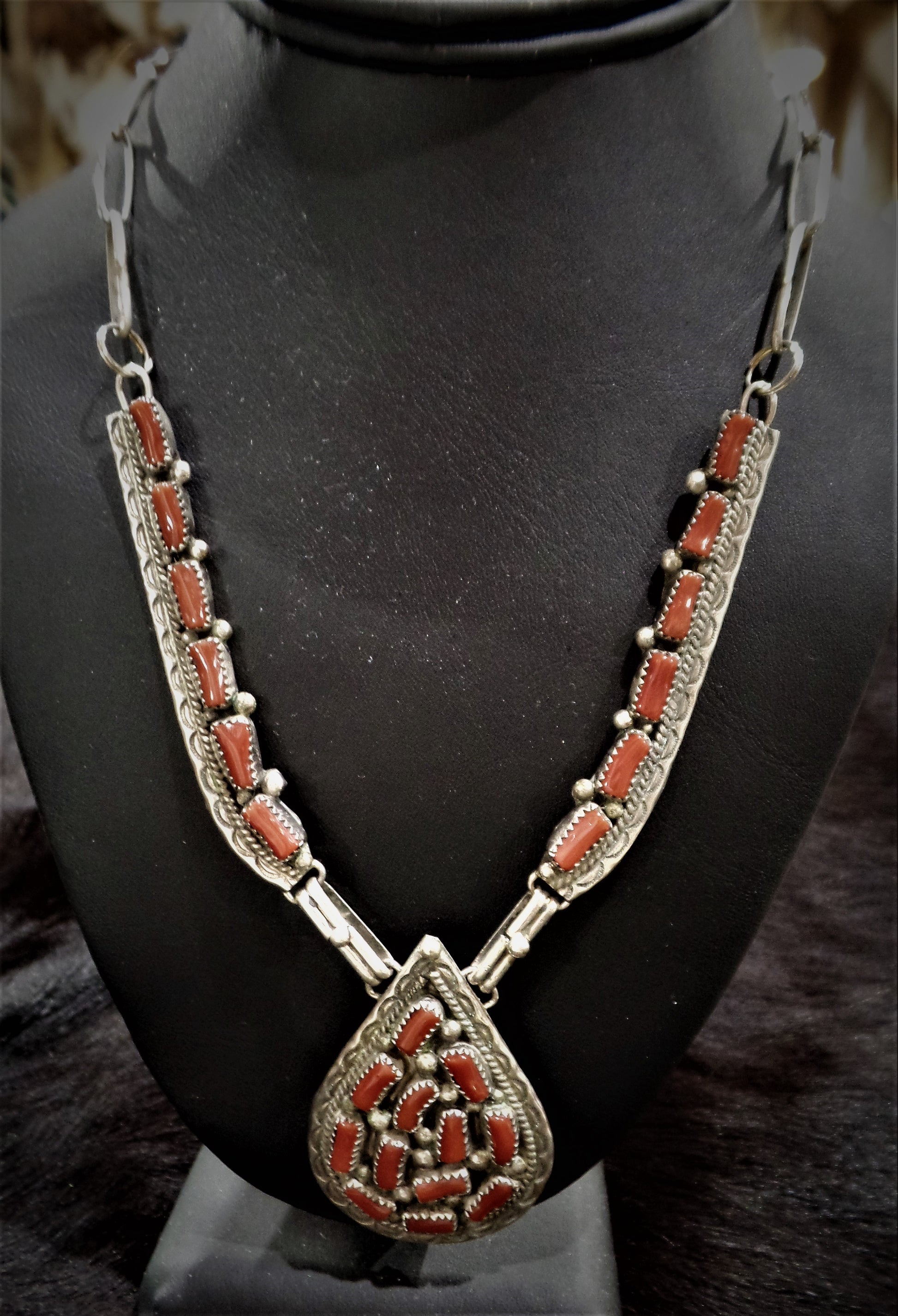 Super Gorgeous Navajo Teardrop Necklace & Earrings. The Centerpiece has 12 Rectangle Apple Coral set in Hammered Sterling Silver. Each Sidebar has 6 gemstones, the Earrings mimick the Sidebars. This is definitely a stand-out piece!