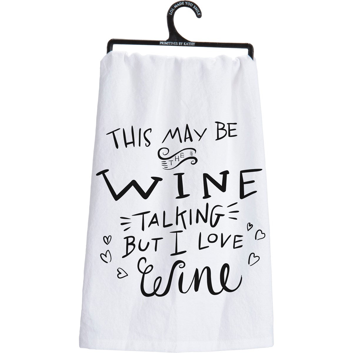 A black and white cotton kitchen towel lending a hand lettered "This May Be The Wine Talking But I Love Wine" sentiment that complements well with existing kitchen decor. Machine-washable. Unfolded this towel is 28"by 28".