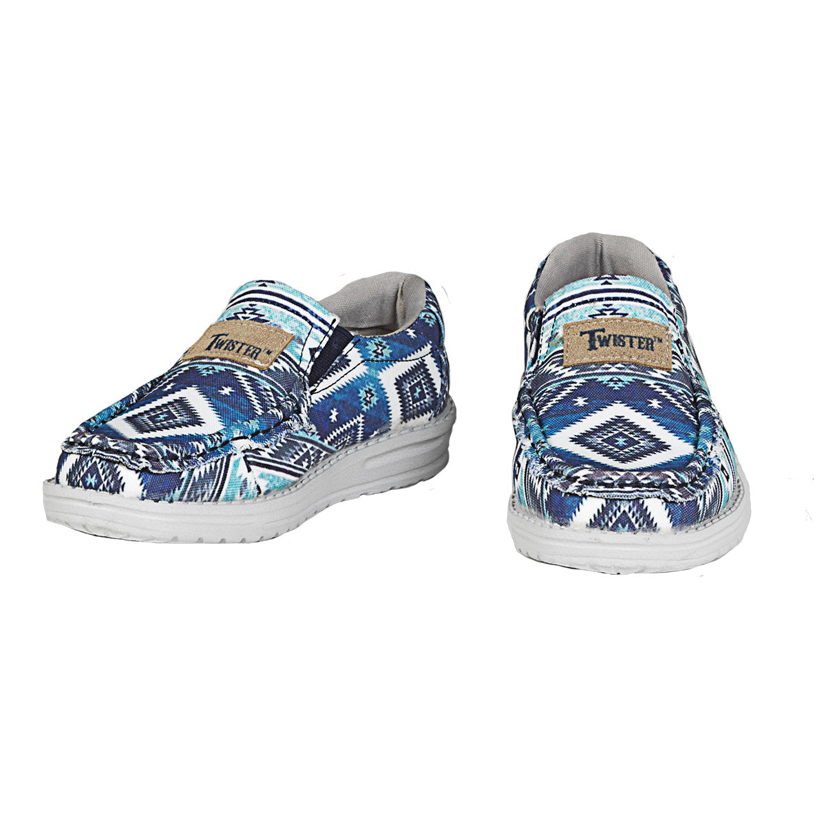 All day fun in these Twister casual toddler shoes by M&F Western Products. Blue southwest pattern canvas fabric. Slip on with EVA outsole, and grey fabric inside and white sole. Super comfortable for all day wear.