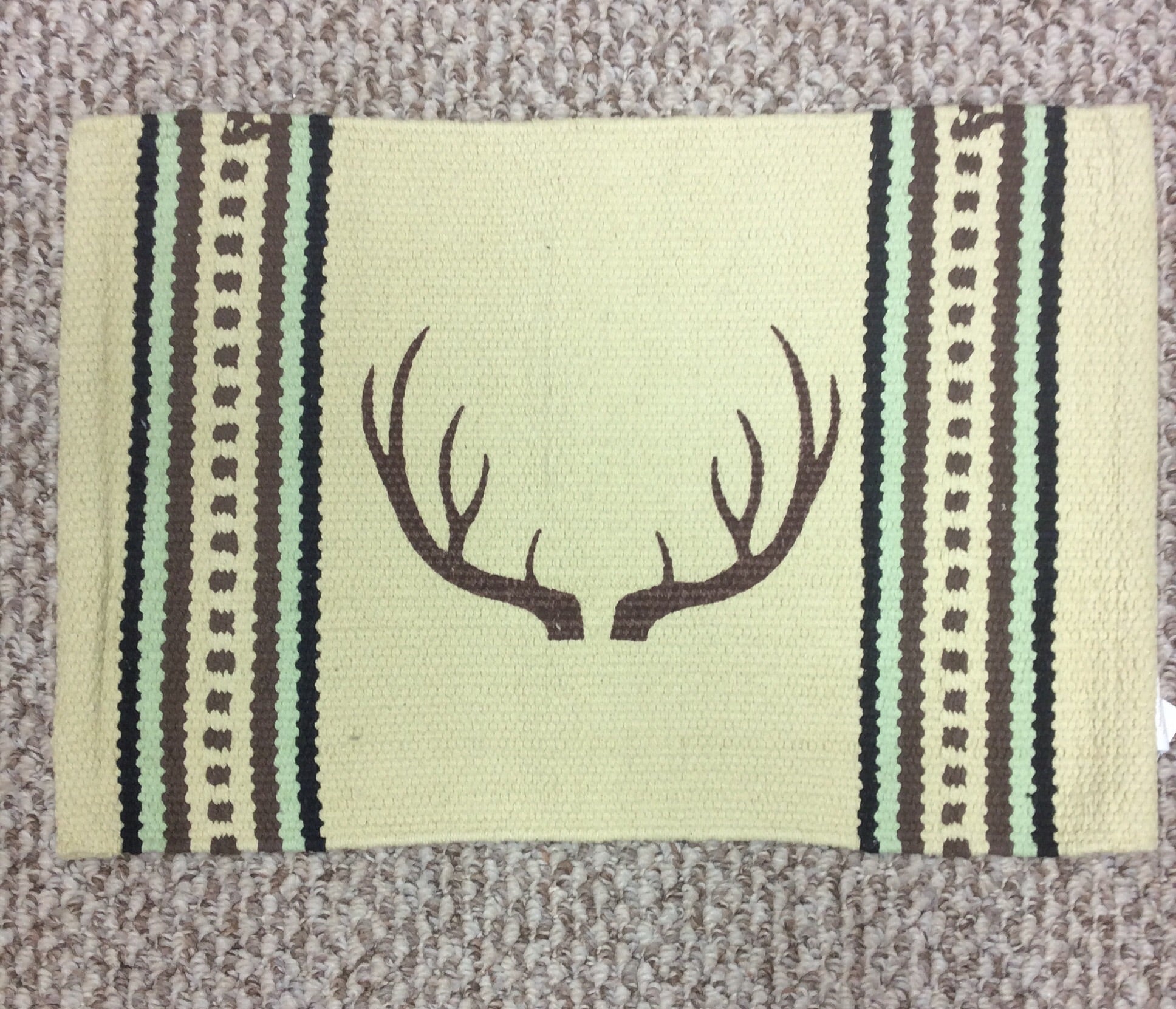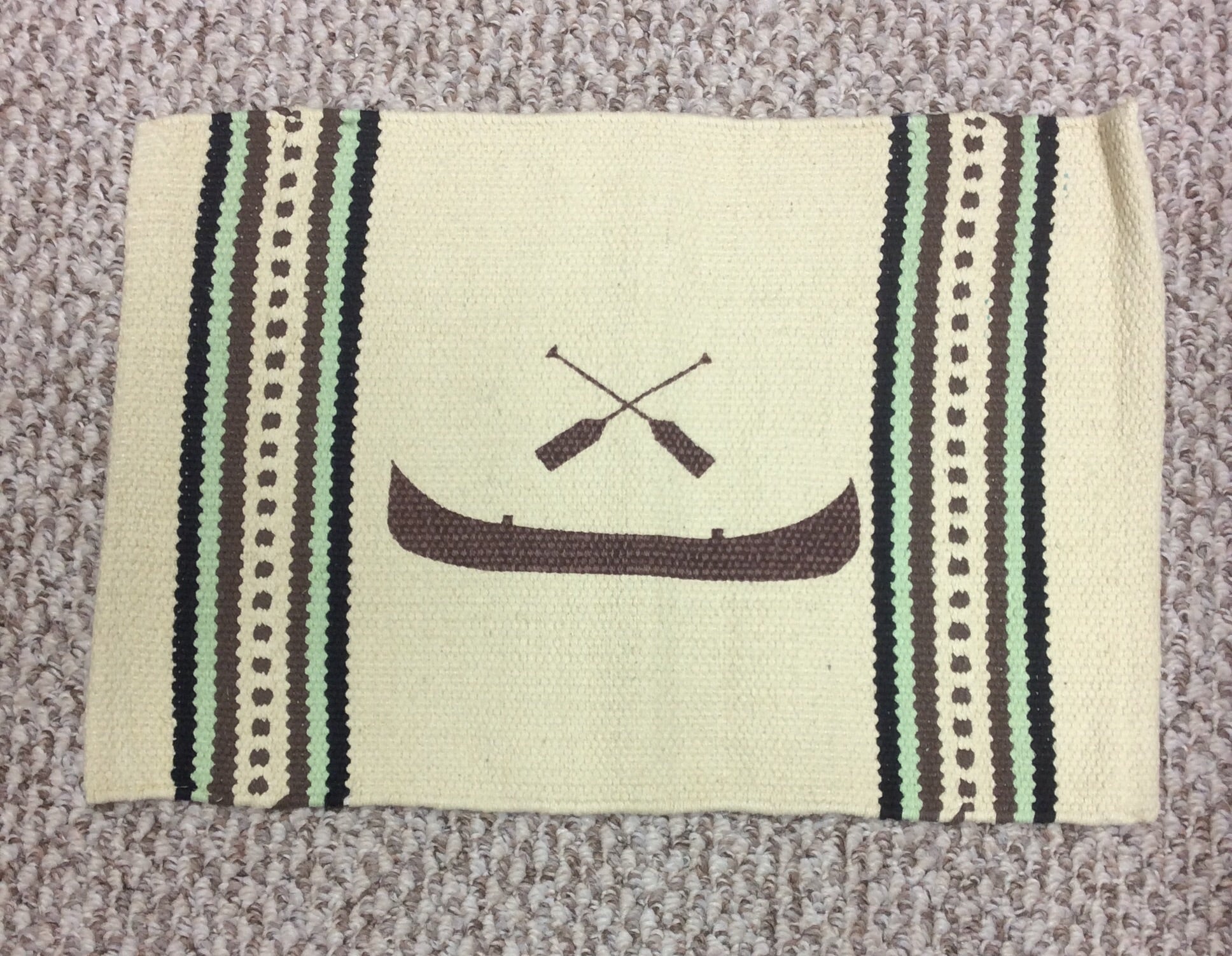 These place mats are a wool and cotton blend. They are a cream background with mint and brown. They come in a antler, canoe, buffalo and horse design.